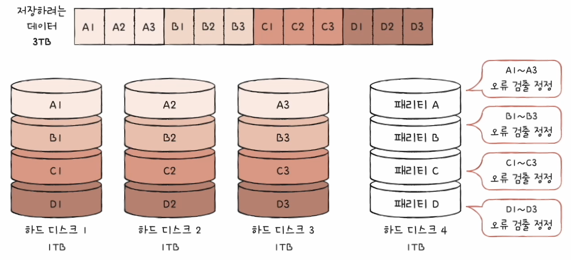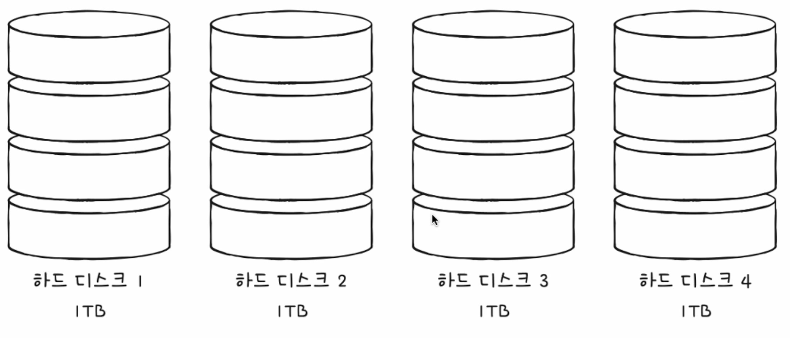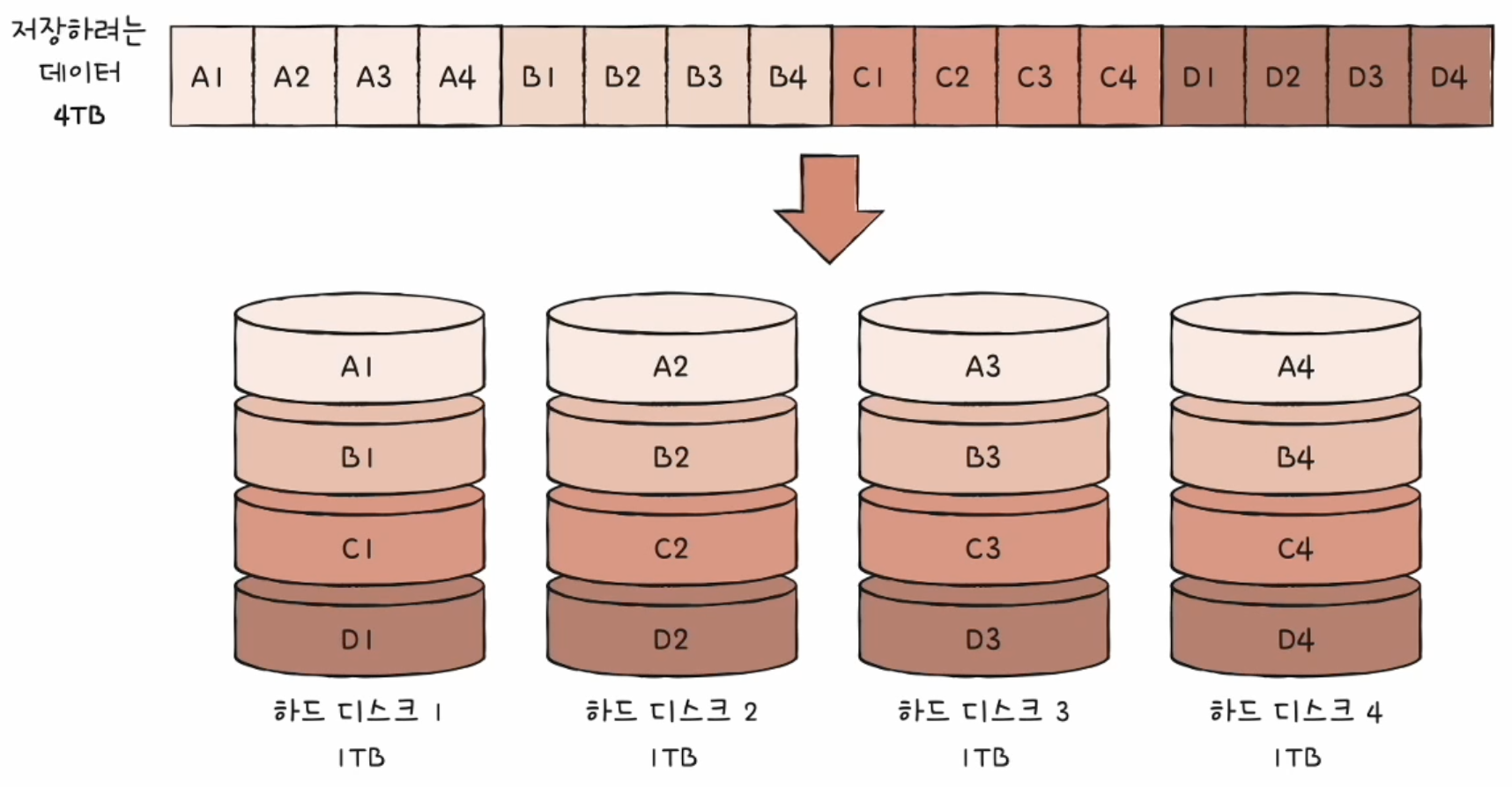 - 즉, 저장되는 데이터가 하드 디스크 개수만큼 나뉘어 저장되는 것이다.