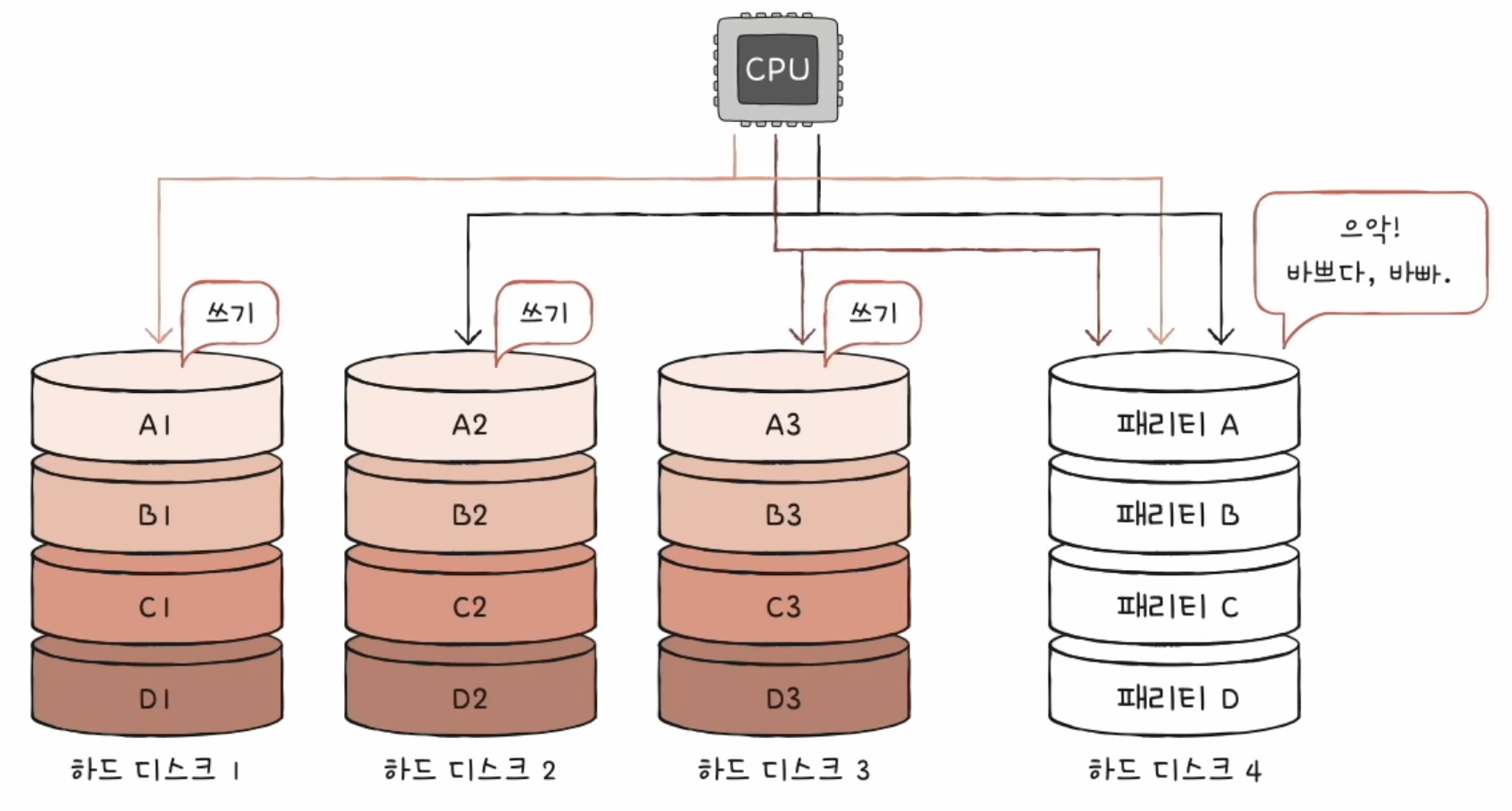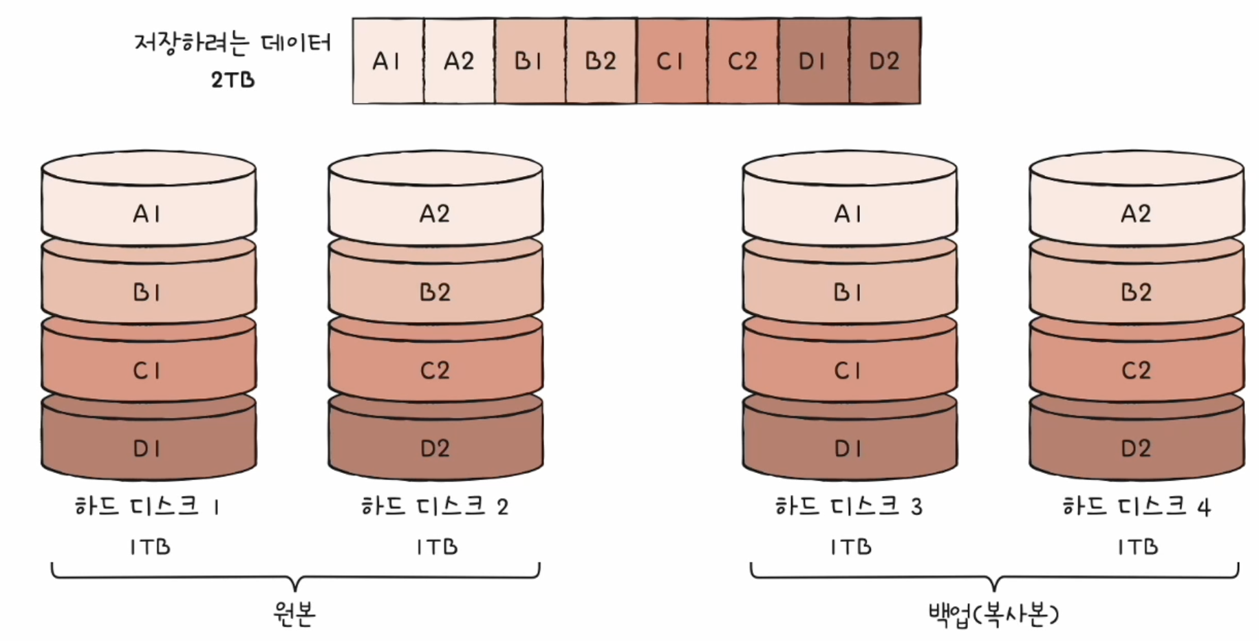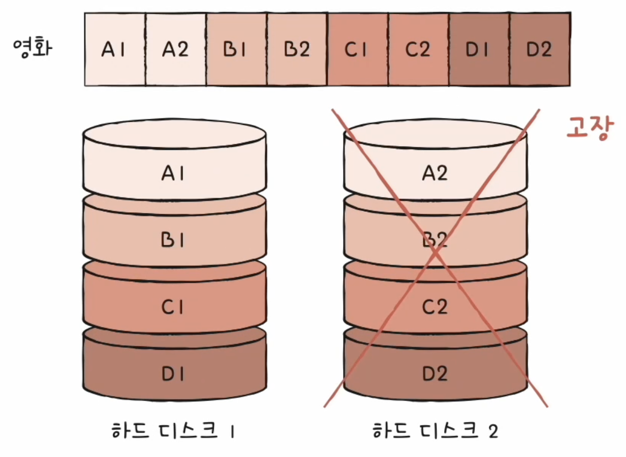 - 어떠한 데이터를 저장할 때 각 하드 디스크는 번갈아 가며 데이터를 저장한다.
