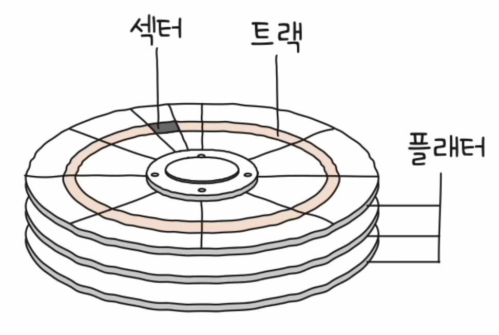 - 하드 디스크에서 실질적으로 데이터가 저장되는 곳은 동그란 원판이다. 이를 플래터라고 한다.