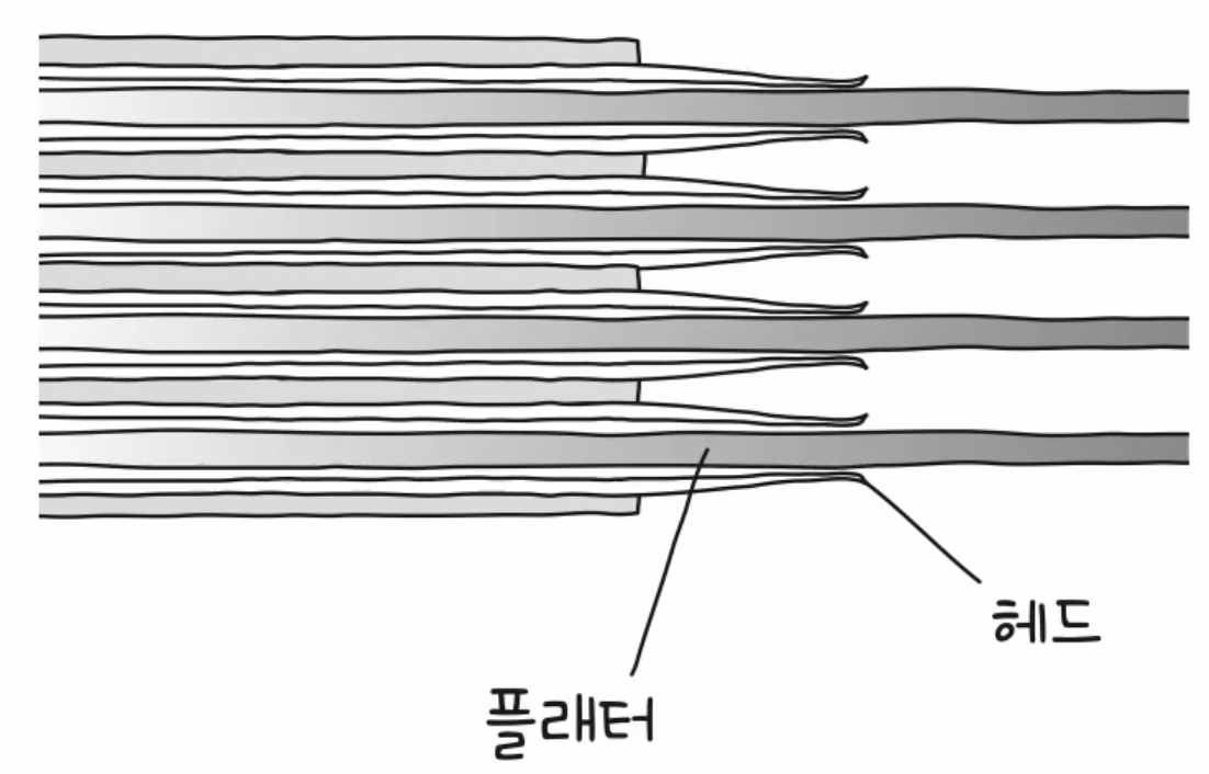 - 헤드는 플래터 위에서 아주 미세하게 떠 있는 채로 데이터를 읽고 쓰는 부품이다. (바늘같이 생겼다)