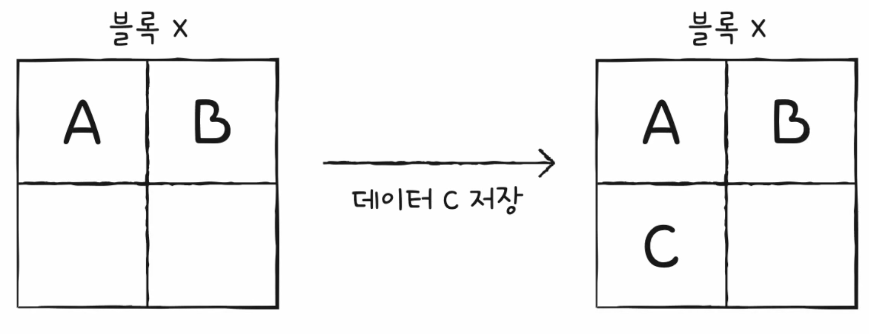 - 만약 블록 X에 새로운 데이터 C를 저장하면 어떻게 될까?