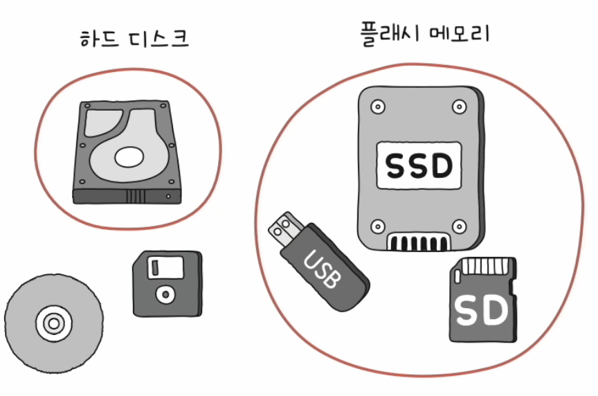 - USB 메모리, SD 카드, SSD가 모두 플래시 메모리 기반의 보조기억장치이다.