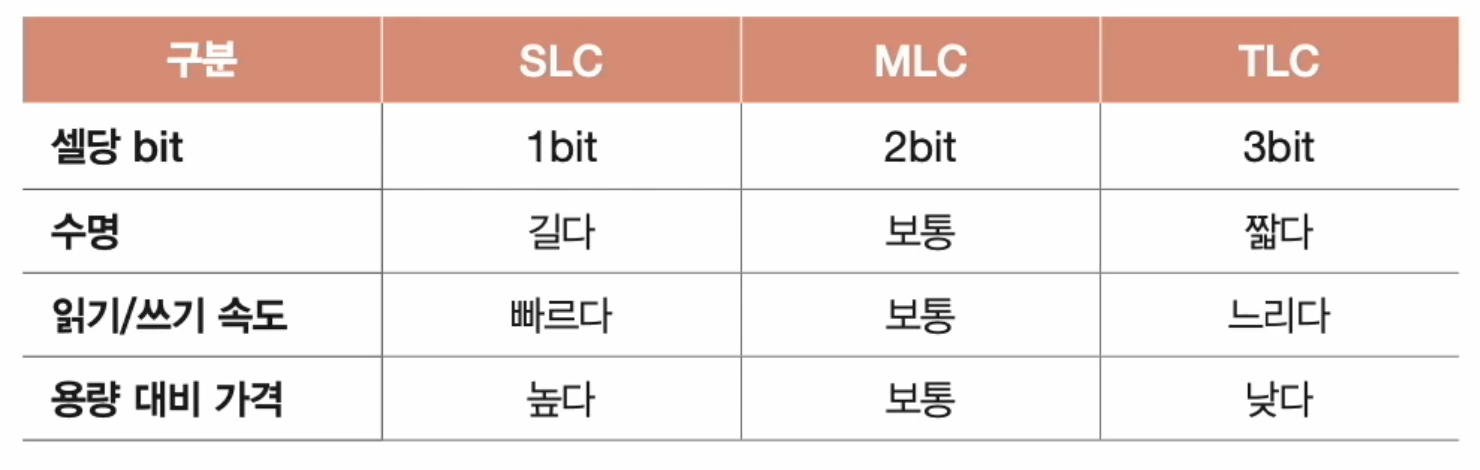 - SLC보다 입출력이 느리고, 수명이 짧지만 SLC보다 저렴하다.