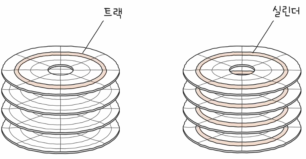 - 즉, 플래터는 트랙과 섹터로 나뉘고, 같은 트랙이 모여 실린더를 이룬다.
