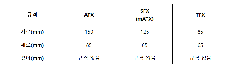 현재 조립 컴퓨터 파워서플라이 사이즈 규격에는 ATX, SFX, TFX 이렇게 3가지로 구분되어있습니다.