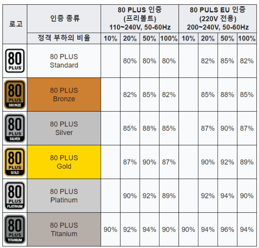 80plus : 전력효율을 80%를 보장한다는 의미로, 80% 밑으로 내려간다면 해당제품은 불량이라는 의미